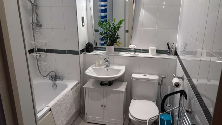 Suite comprising: Paneled bath with shower attached. Pedestal wash hand basin. Low level flush W.C.