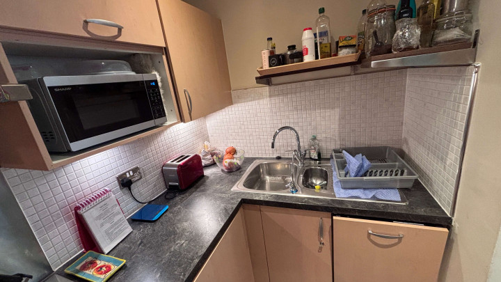 Kitchen 8'0” x 5'0” (2.4m x 1.5m) Wall and base units with work surface over. 1 and a half bowl stainless steel sink with drainer unit. Tile splash back. Tiled floor. Stainless steel oven hob and extractor fan. Integrated fridge/freezer, washing machine and dishwasher.