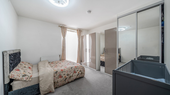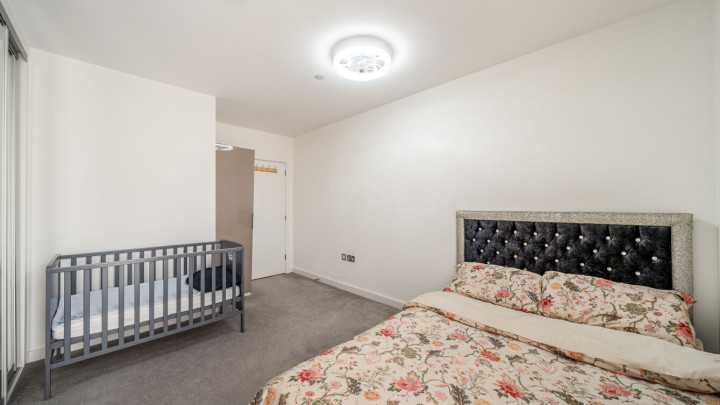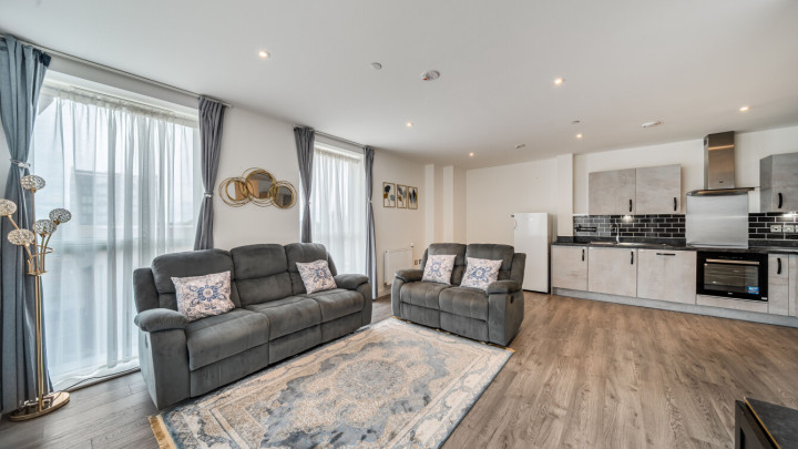 This apartment centres on a particularly spacious L-shaped, dual aspect open-plan kitchen and living area, flooded with natural light, which opens onto a private west facing balcony. The modern kitchen is fitted with matt grey wall and base units, with stylish under-cupboard lighting, and a marble effect worktop. It also benefits from integrated appliances including a fridge freezer, oven, hob, extractor fan and dishwasher. There is a generous double bedroom including mirrored wardrobes. A contemporary family bathroom completes the accommodation.