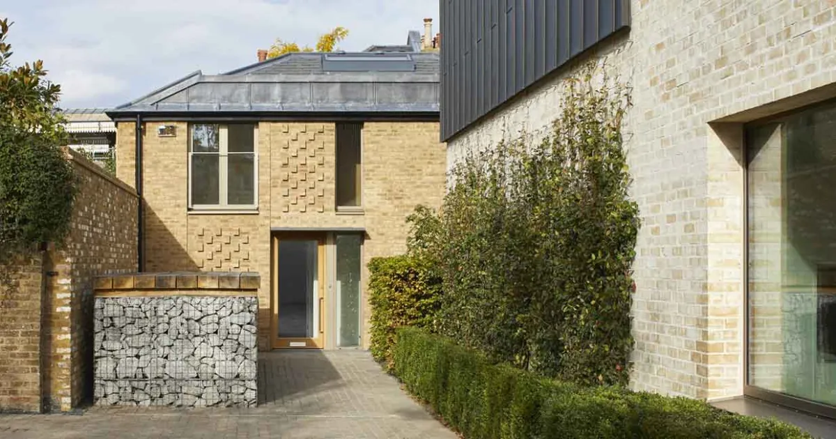 Five three-storey houses form a terrace which steps forward incrementally along its length. A sixth two-storey house is built within the walls of Latymer House, which once stood on the site.