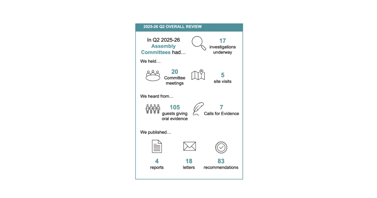During this quarter, Assembly committees continued their agreed work programmes, carrying out multiple investigations across all Committees, and varied activities including visits, roundtables and informal meetings. It produced several publications, including the Housing Committee Report on Affordable Housing and the Transport Committee Publication on Fare Evasion.